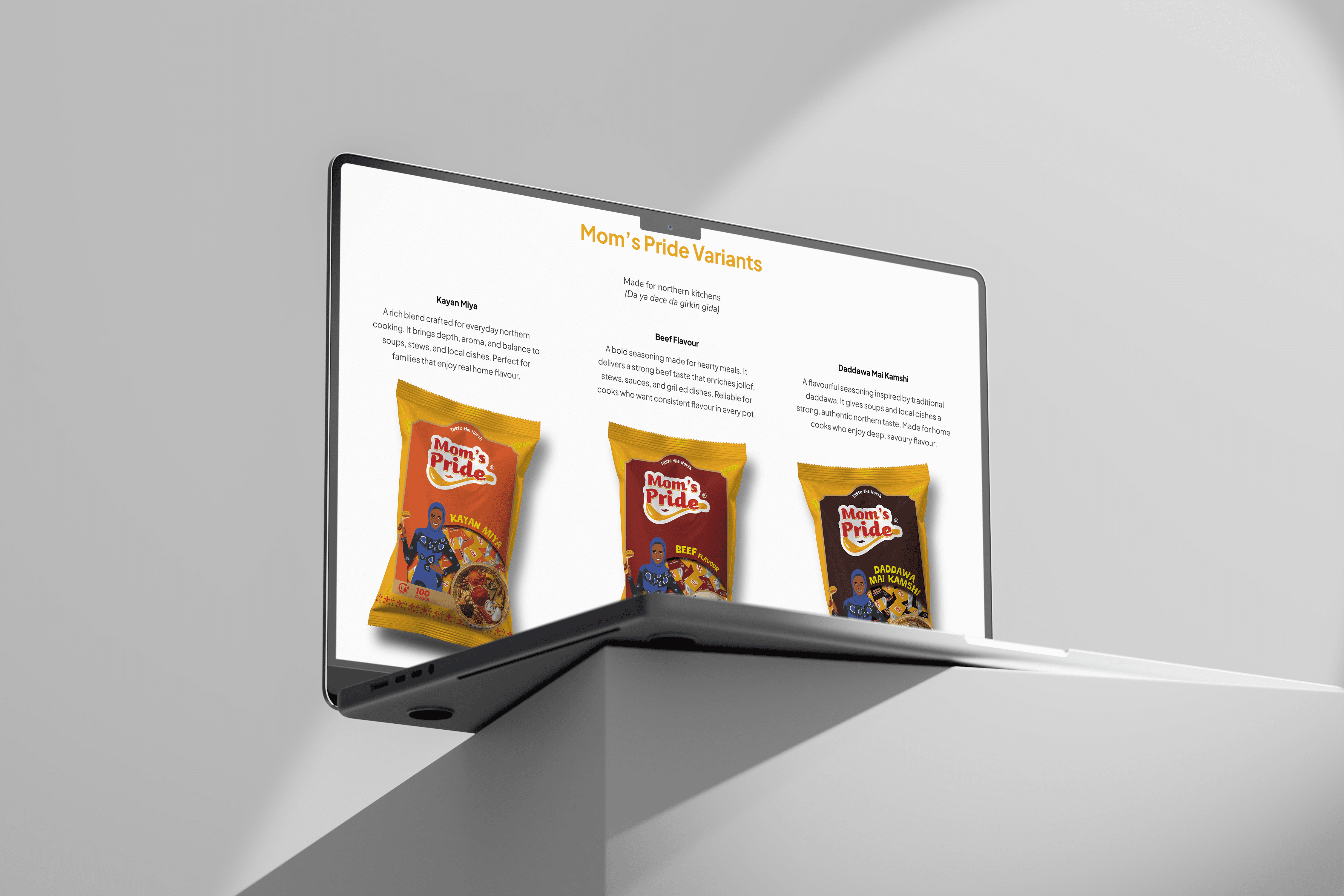 Mom’s Pride is a Nigerian spice company specializing in authentic local blends that capture the depth and richness of traditional Nigerian cuisine. The design challenge was to create a visual identity and packaging system that reflects cultural authenticity while standing out in a crowded retail environment.
